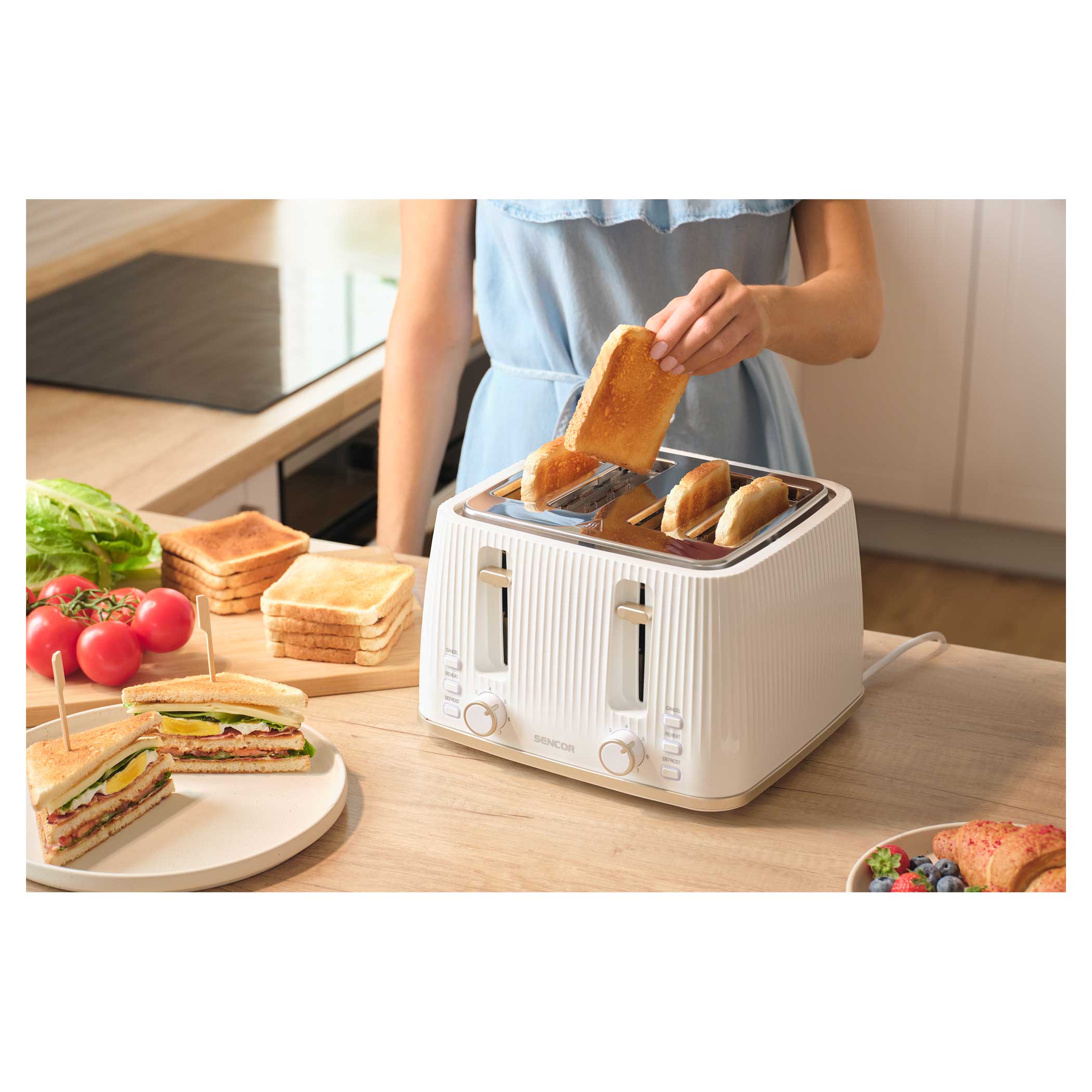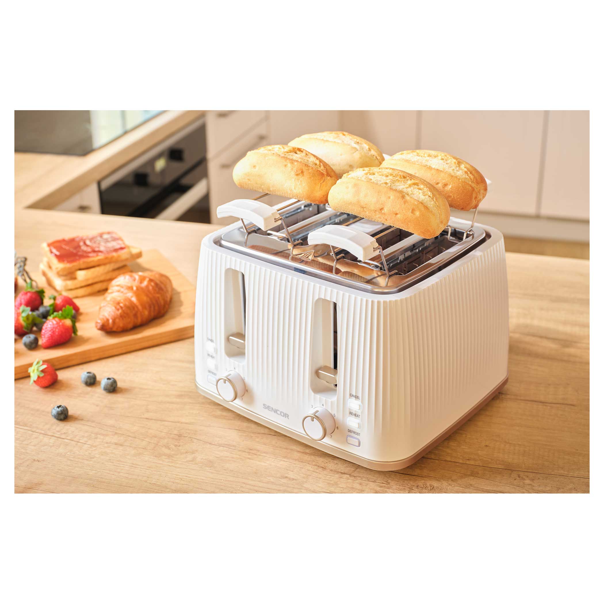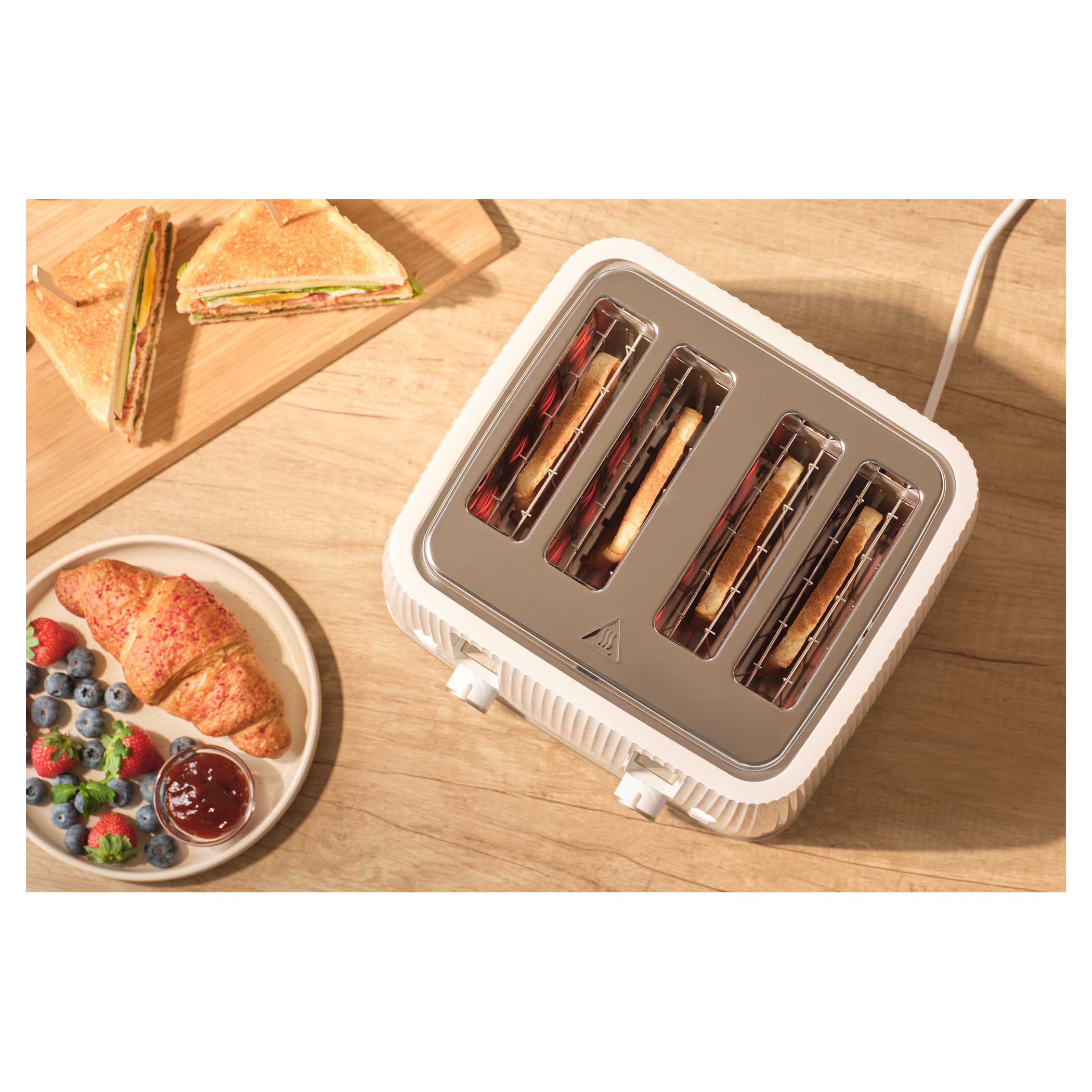 С помощью тостера вы легко сможете приготовить тосты в точном соответствии с вашими предпочтениями благодаря 7 уровням интенсивности поджаривания и 4 ячейкам для тостов. Вы можете использовать решетку для тостов для поджаривания разных видов хлеба. Благодаря 3 функциям тостер разогревает, поджаривает и размораживает хлеб. При необходимости предусмотрена функция мгновенной остановки.• 4 ячейки для тостов